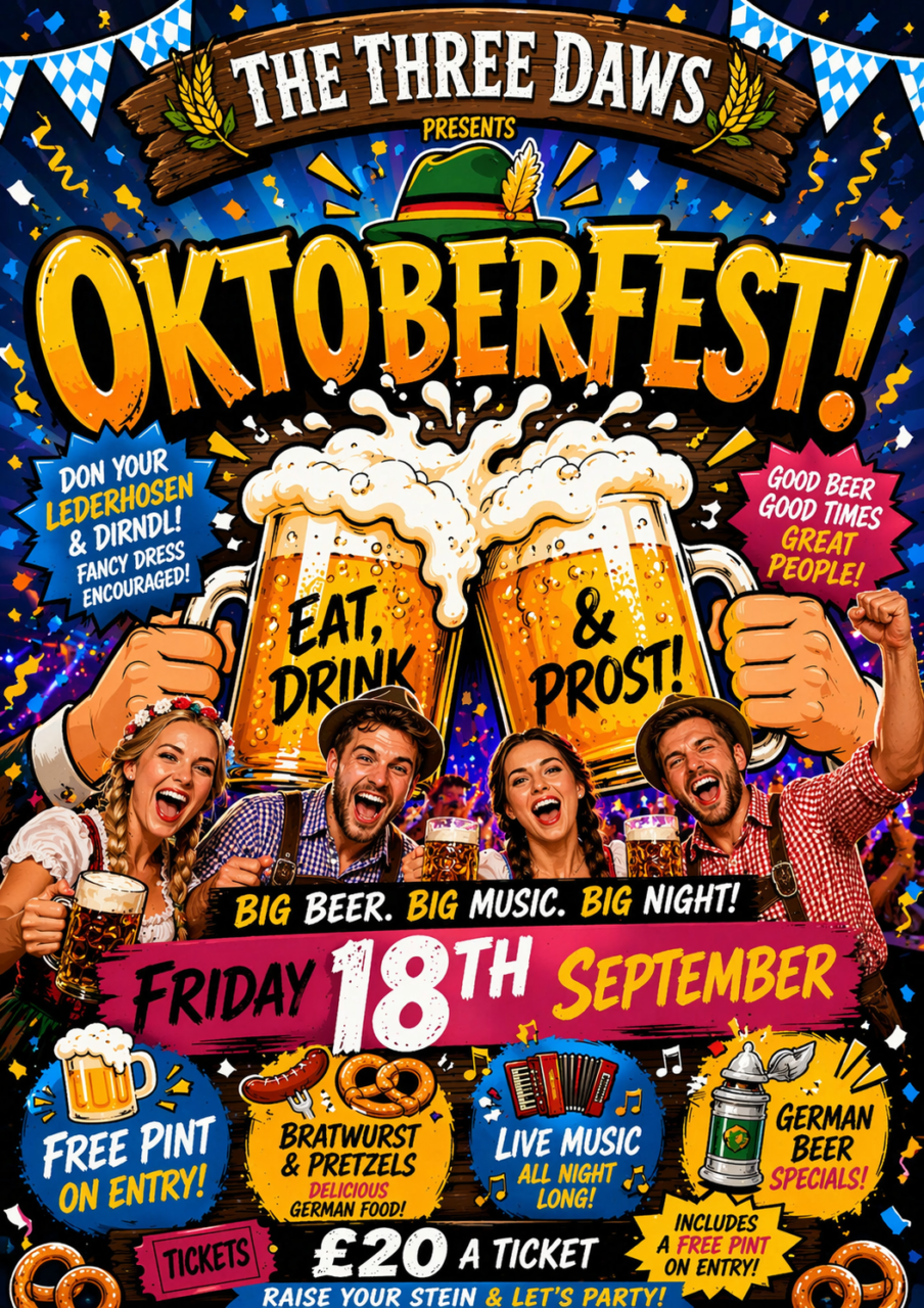 « All Events Oktoberfest 2026 (ticketed event) September 18 @ 6:30 pm - 11:30 pm Event Navigation « Our Annual Beerfest COMEDY NIGHT (Presented by Out of Bounds Comedy) » Add to calendar Google Calendar iCalendar Outlook 365 Outlook Live Details Date: September 18 Time: 6:30 pm - 11:30 pm Venue Downstairs Function Room The Three Daws, Town Pier Gravesend, Kent DA11 0BJ United Kingdom + Google Map Phone 01474 566869 View Venue Website